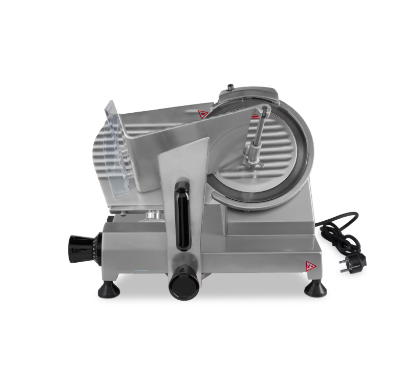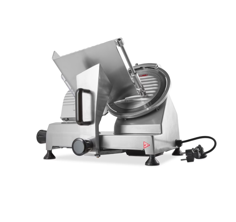 Diese robuste Aufschnittmaschine sorgt nicht nur für schnelle, sondern auch für sichere Schnitte. Das Design hält die Hände von der Klinge fern, und der Motor verfügt über eine integrierte Sicherheitsfunktion. Die abgewinkelte Anordnung der Klinge gewährleistet gleichmäßiges und effizientes Schneiden. Zusätzlich ist ein Aufsatz zum Schärfen der Klinge enthalten, der die Sicherheit und Leistung erhöht. Nach dem Schärfen sollte die Maschine gründlich gereinigt werden, um zu vermeiden, dass Schleifpartikel in die Lebensmittel gelangen.
