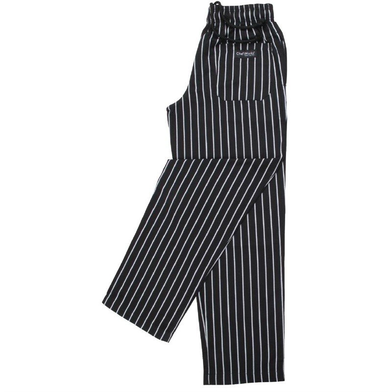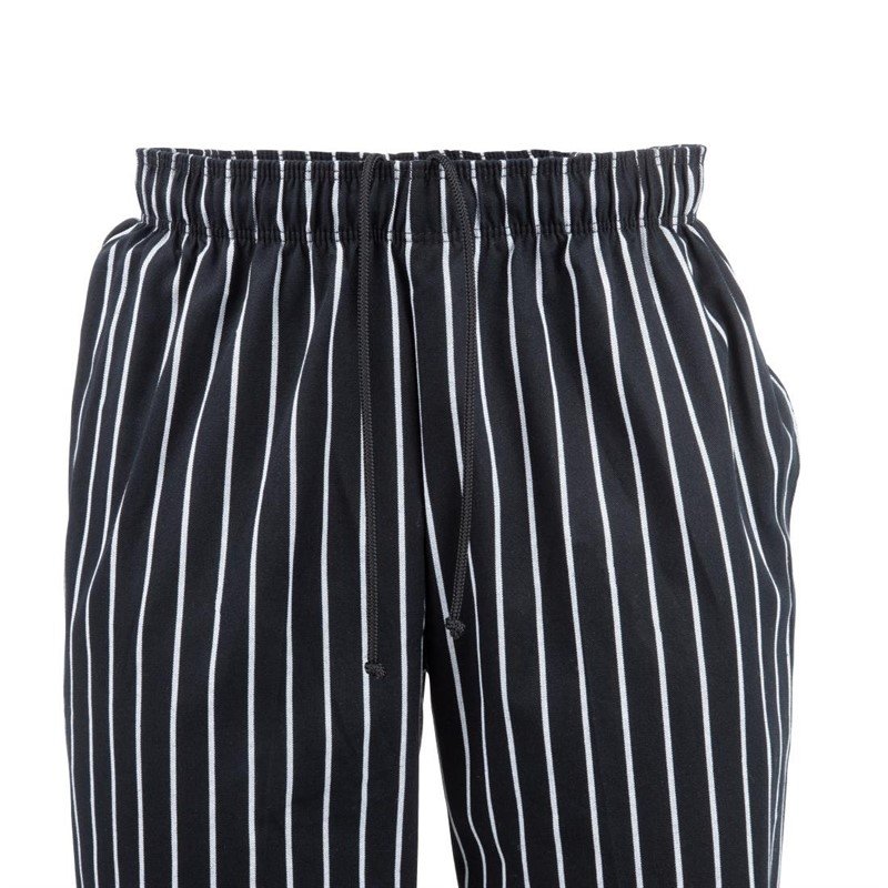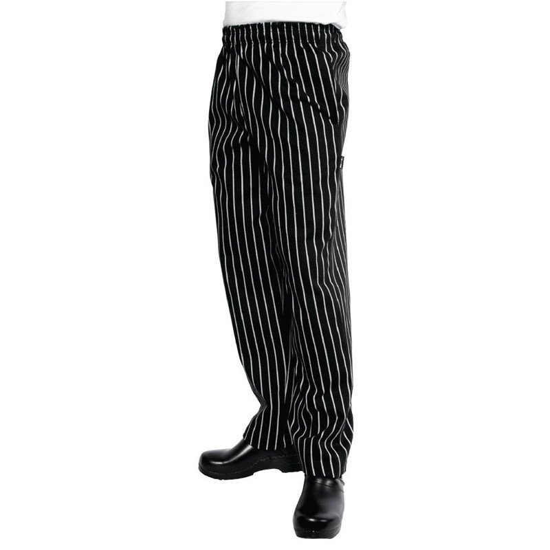 Die schwarze ‚Easyfit‘ Kochhose von Chef Works für Damen und Herren bietet ganztägigen Komfort in der Küche. Mit weißen Streifen versehen, ist diese Hose sowohl praktisch als auch bequem. Sie lässt sich problemlos waschen und kommt ohne empfindliche Knöpfe aus. Die langen Hosenbeine können nach Belieben umgeschlagen werden, um eine bessere Passform zu erzielen. Zusätzlich sind auch Teflon-beschichtete ‚Easyfit‘ Kochhosen aus Polybaumwolle erhältlich, die einen noch besseren Schutz vor Verschüttungen bieten (Produkt A029). Erhältlich in den Größen XS bis XXL.